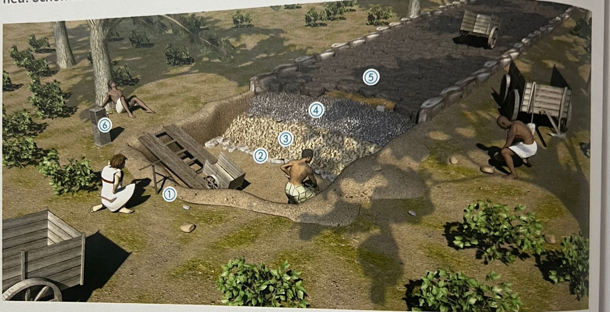 Im römischen Reich waren Straßen sehr wichtig, damit Soldaten, Händler und Nachrichten schnell von einem Ort zum anderen gelangen konnten. Die Römer bauten ihre Straßen sehr sorgfältig und in mehreren Schichten. Zuerst wurde der Boden geebnet und mit einem Vermessungsgerät genau ausgerichtet, damit die Straße gerade verlief. Dann legten die Arbeiter eine Schicht aus groben Steinen auf den Boden, um eine stabile Grundlage zu schaffen. Darüber kam eine Schicht aus Kies und Sand, die für eine gute Drainage sorgte. Anschließend wurde eine Schicht aus Schotter verteilt, um die Straße noch fester zu machen. Ganz oben legten die Römer große, flache Steine als Pflaster, damit die Straße eben und haltbar war. Entlang der Straßen standen oft Meilensteine, auf denen die Entfernung zu wichtigen Städten angegeben war. So konnten Reisende immer sehen, wie weit ihr Ziel noch entfernt war.